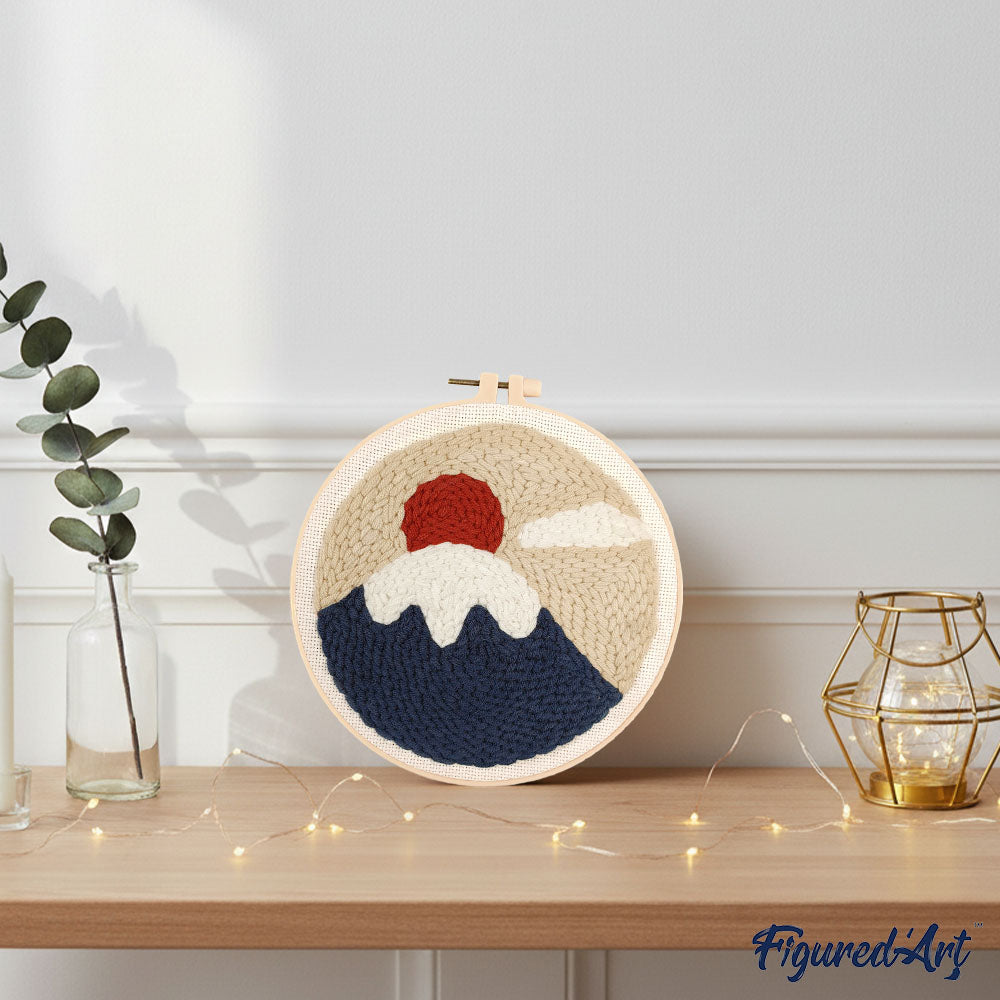 Entdecken Sie das Punch Needle Set Sonnenaufgang über dem Fuji – Punch Needle 20 x 20 cm von Figured'Art, ein kompaktes, hochwertiges Kit, das Kreativität sofort freisetzt und sofort einsatzbereit ist.