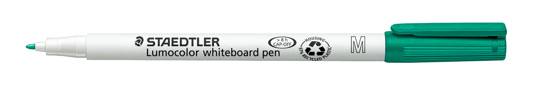 Der Lumocolor® whiteboard pen 301 grün von STAEDTLER ist die zuverlässige Wahl für kleine Whiteboards, das Lumocolor memo board 641 und Schülertafeln. Mit 8h CAP-OFF kann der Stift acht Stunden offen liegen, ohne einzutrocknen, und bleibt trocken sowie rückstandsfrei abwischbar auf Whiteboards, Glas, Porzellan und anderen glatten Flächen.
