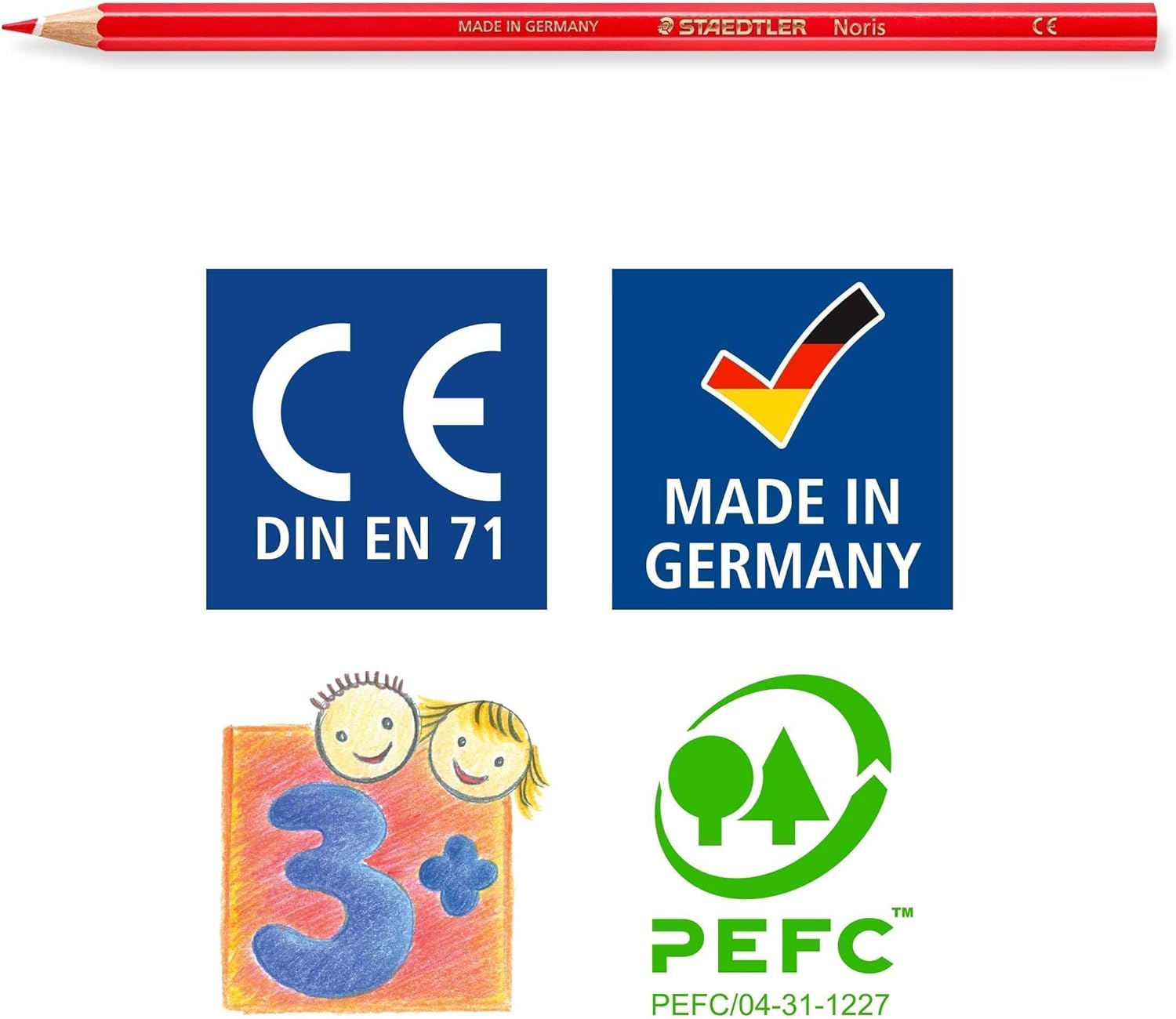 Buntstift im klassischen Sechskantformat A·B·S - der weisse Schutzmantel verstärkt den Minenkern und erhöht die Bruchfestigkeit Erhältlich in 36 Farben Holz aus PEFC-zertifizierten, nachhaltig bewirtschafteten Wäldern Spitzer Empfehlung: Noris Doppelspitzdosen 512 002 und 512 128 für ideale Spitzergebnisse Produkte mit der CE-Kennzeichnung entsprechen der europäischen Norm EN 71