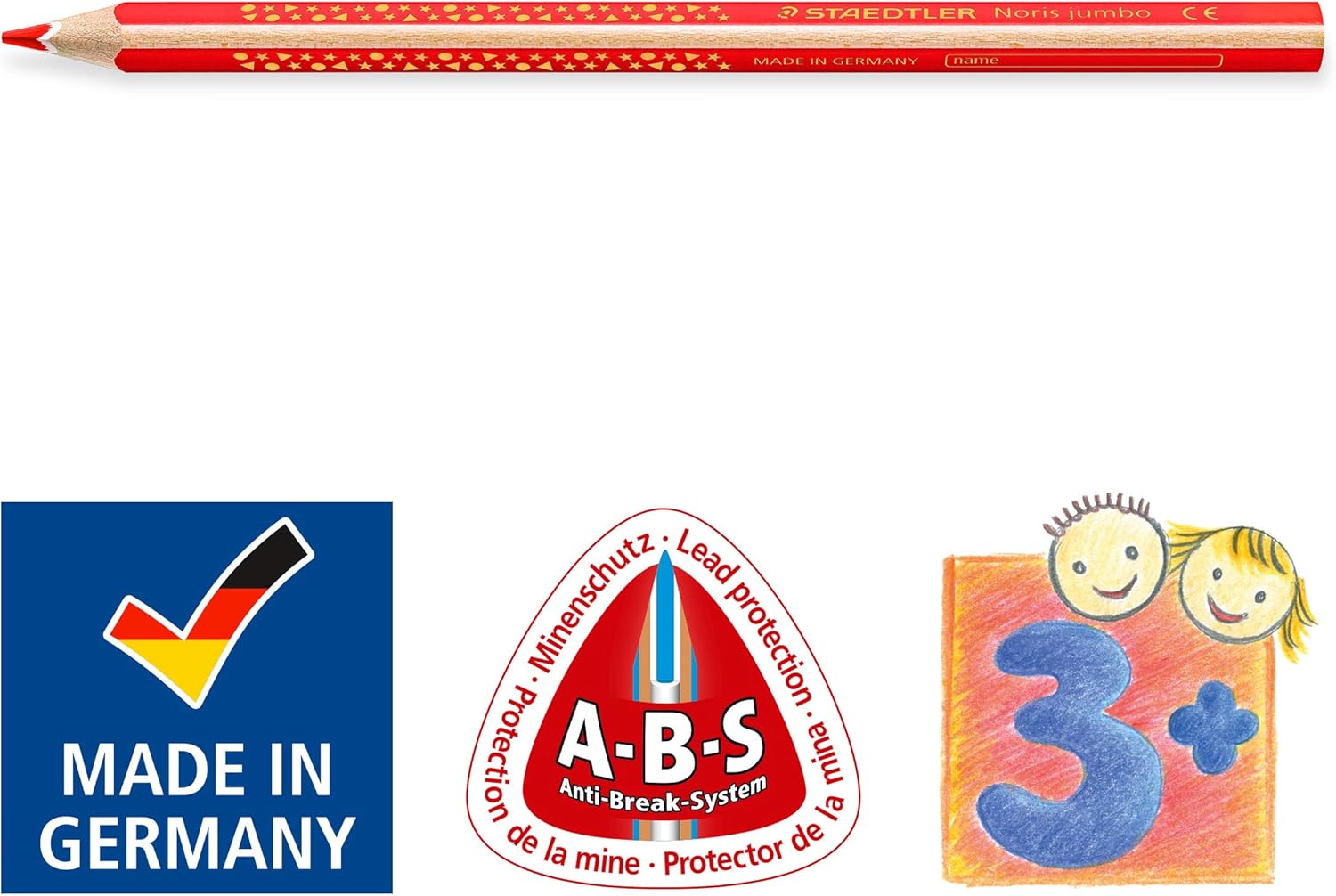 Jumbo Buntstift im ergonomischen Dreikantformat für entspanntes Malen Ideal für die ersten Schwung- und Malübungen A·B·S - der weisse Schutzmantel verstärkt den Minenkern und erhöht die Bruchfestigkeit Attraktives Sternchendesign mit Namensfeld Einzelstift in bis zu 10 Farben Holz aus FSC-zertifizierten, nachhaltig bewirtschafteten Wäldern Spitzer Empfehlung: Noris Doppelspitzdose 512 128 oder Metall-Doppelspitzer 510 20 für ideale Spitzergebnisse Produkte mit der CE-Kennzeichnung entsprechen der europäischen Norm EN 71