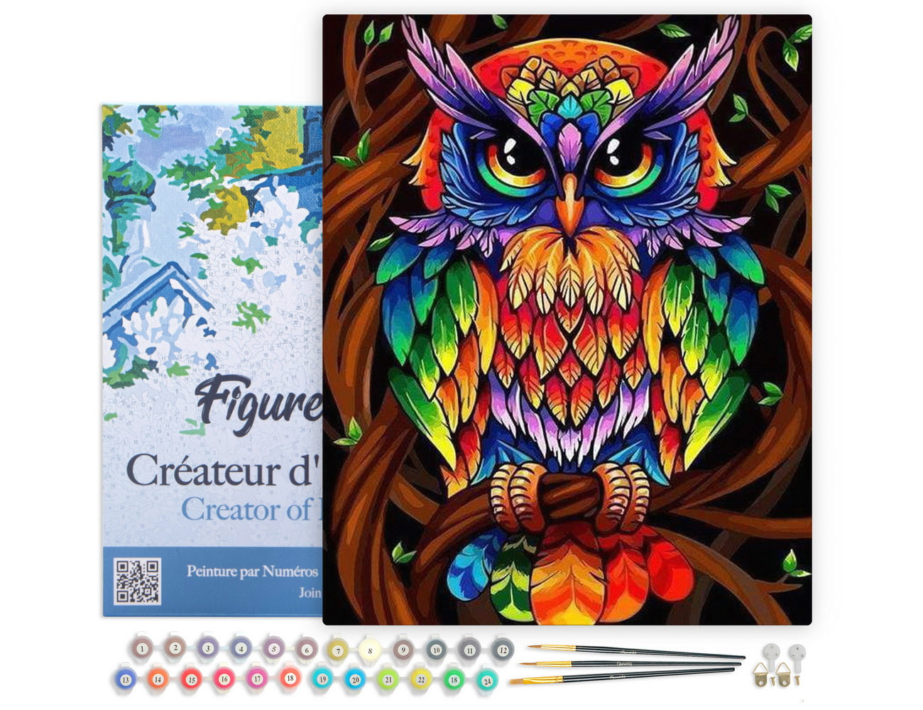 Figured'Art Malen nach Zahlen – Farbige Eule, 40x50 cm, auf Keilrahmen gespannt, ist ein hochwertiges Komplett-Set, das kreative Pausen in entspannter Atmosphäre ermöglicht.