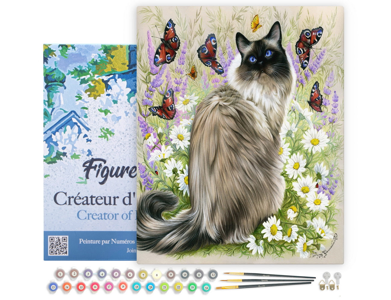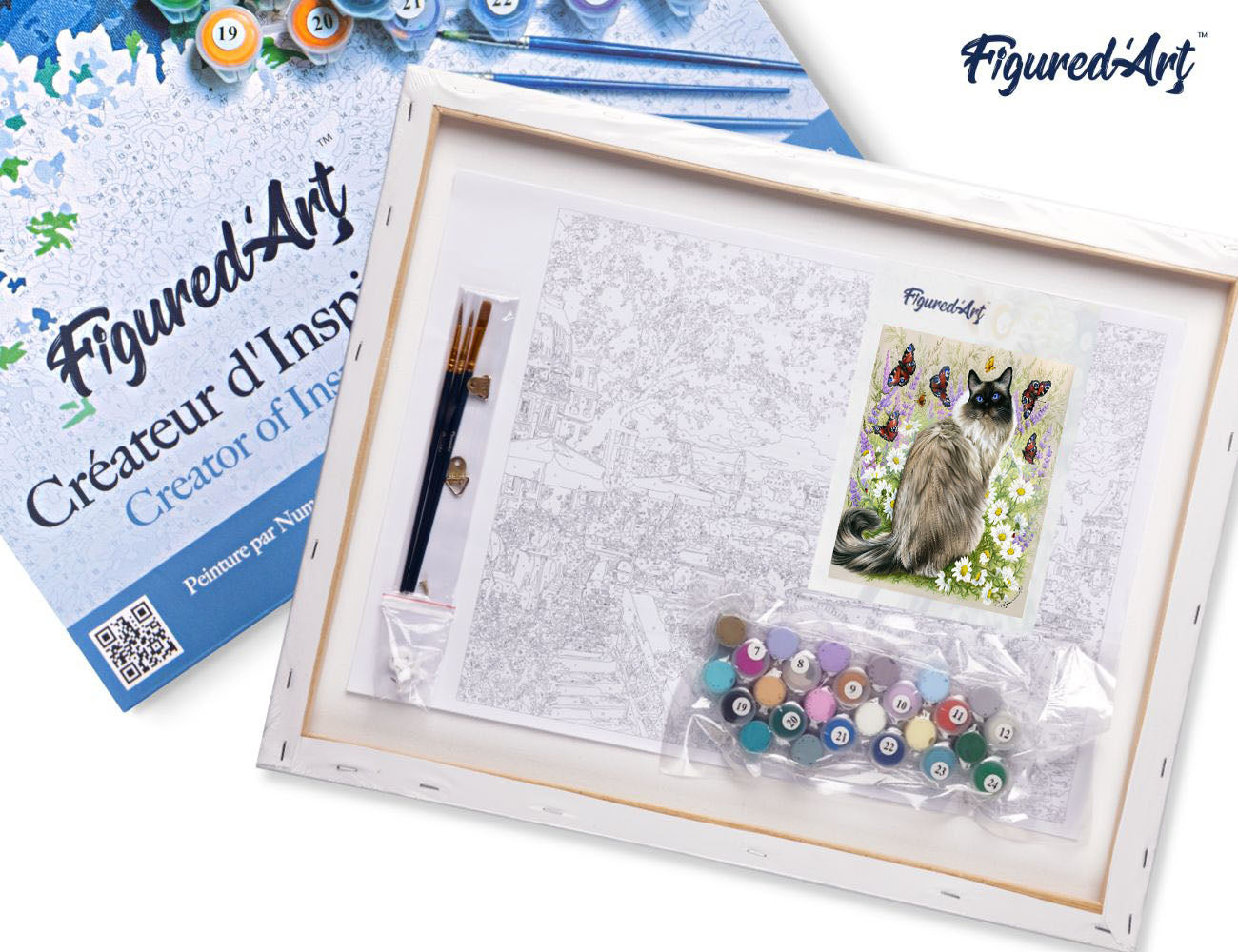 Entdecken Sie mit Figured'Art Malen nach Zahlen die entspannende Welt der Kreativität. Das 40x50 cm große Set auf Keilrahmen stellt eine charmante Szene mit einer Katze und Schmetterlingen dar und verbindet einfache Handhabung mit beeindruckenden Ergebnissen – ideal für Einsteiger und erfahrene Hobbykünstler gleichermaßen.
