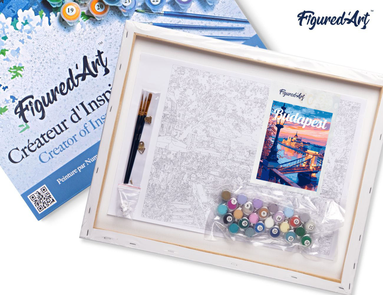 Malen nach Zahlen 40x50cm auf Keilrahmen gespannt Figured’Art Reiseposter Budapest bei Dämmerung