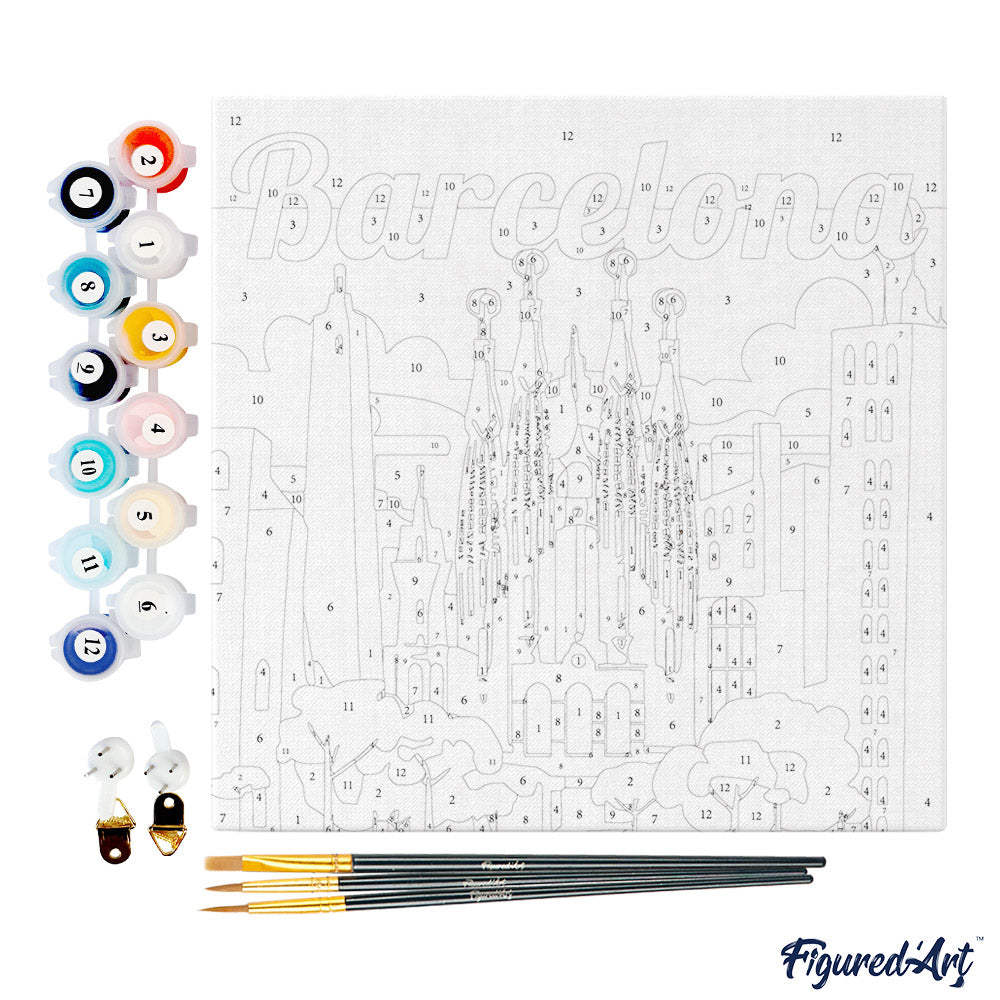 • Nummeriertes Farbset – abgestimmte Acrylfarben für das Motiv Barcelona.