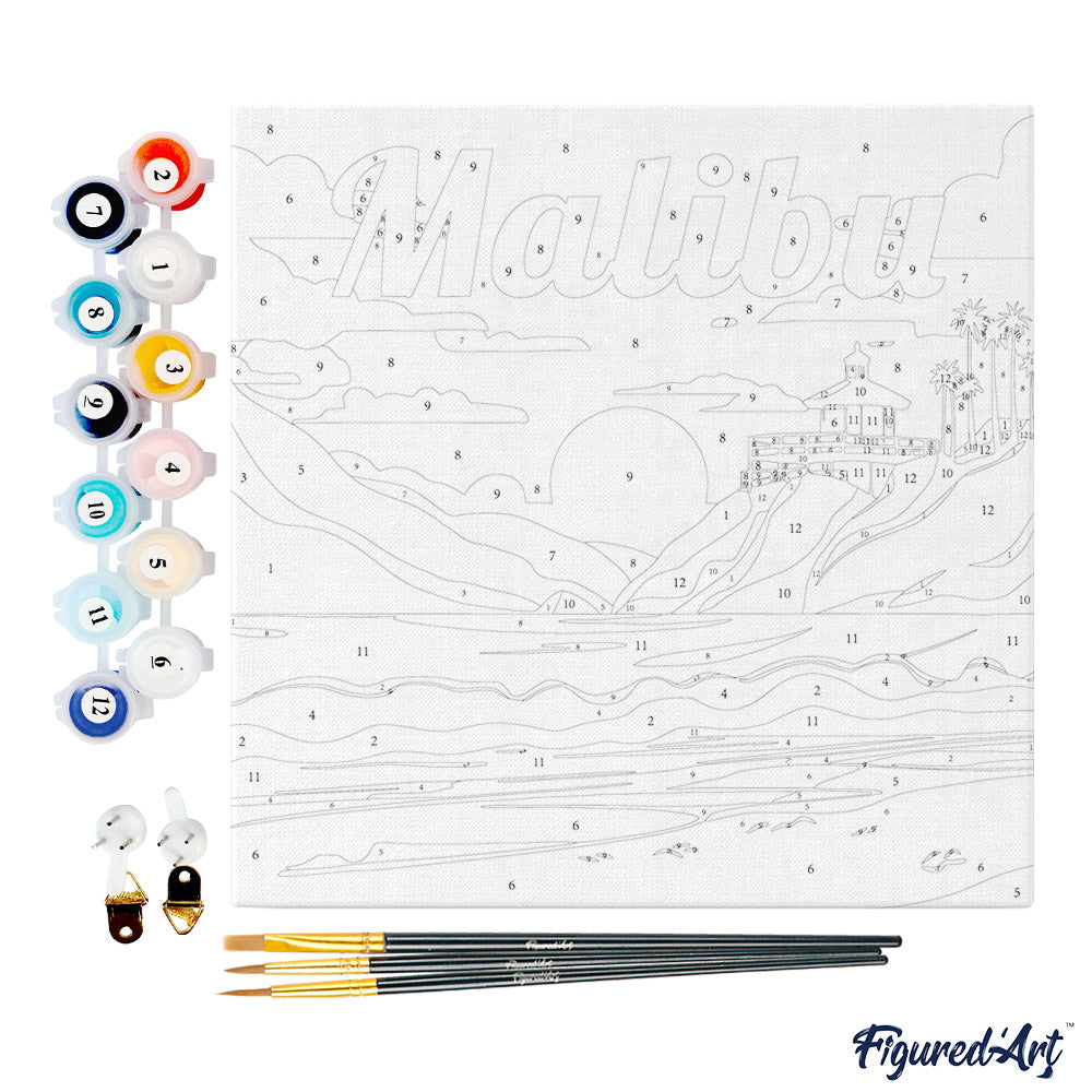 Dieses kompakte Set bietet alles für ein sofortiges Malerlebnis. Bestellen Sie jetzt und starten Sie Ihr Malibu-Reiseplakat mit Figured'Art. Lieferzeit 2–3 Wochen.