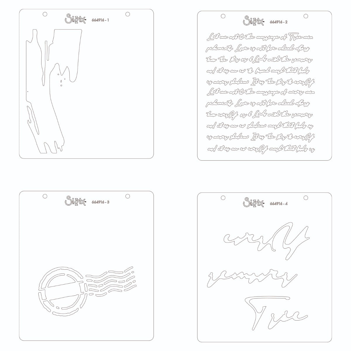 Das Schablonen-Set "Scroll Text" von Sizzix umfasst vier Schablonen mit einem eleganten Scroll-Text-Motiv. Die vier Motive ermöglichen vielseitige Text-Layouts für Karten, Scrapbooking oder journaling. Die Schablonen bieten klare Linien, die saubere Kanten beim Auftragen von Farbe, Tinte oder Strukturpaste gewährleisten.