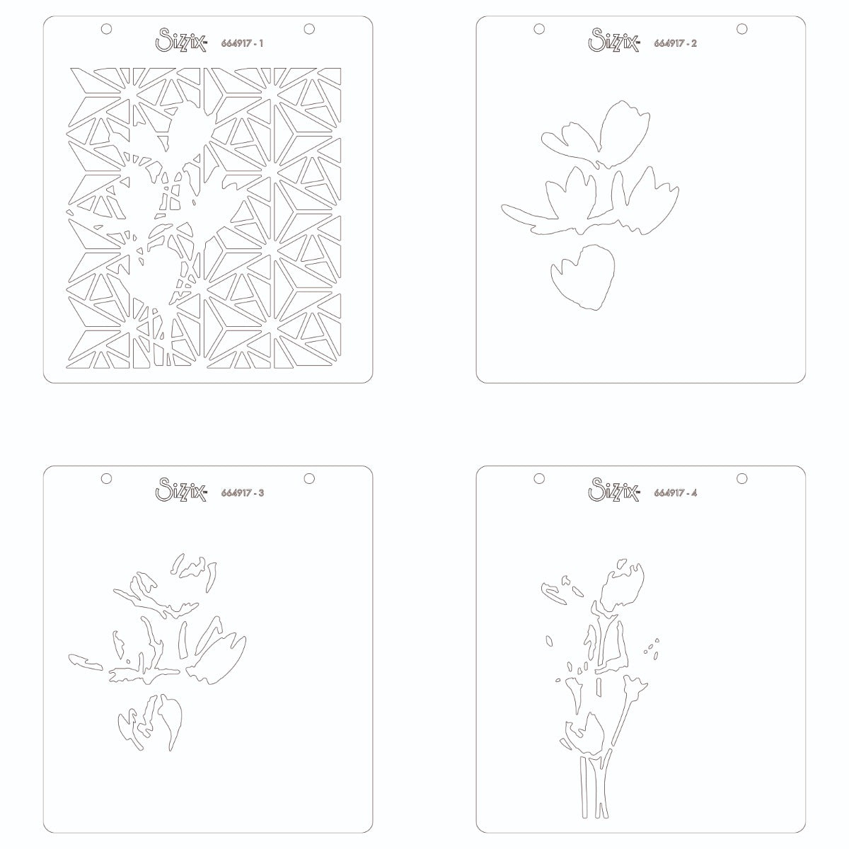 Schablonen 4 Stück - Geo Blumen von Sizzix ist ein kompaktes Set mit vier Vorlagen, die geometrische Blumendesigns vereinen. Die wiederverwendbaren Schablonen ermöglichen konsistente Muster in verschiedenen Bastelprojekten und bieten klare Linien sowie symmetrische Blütenformen.