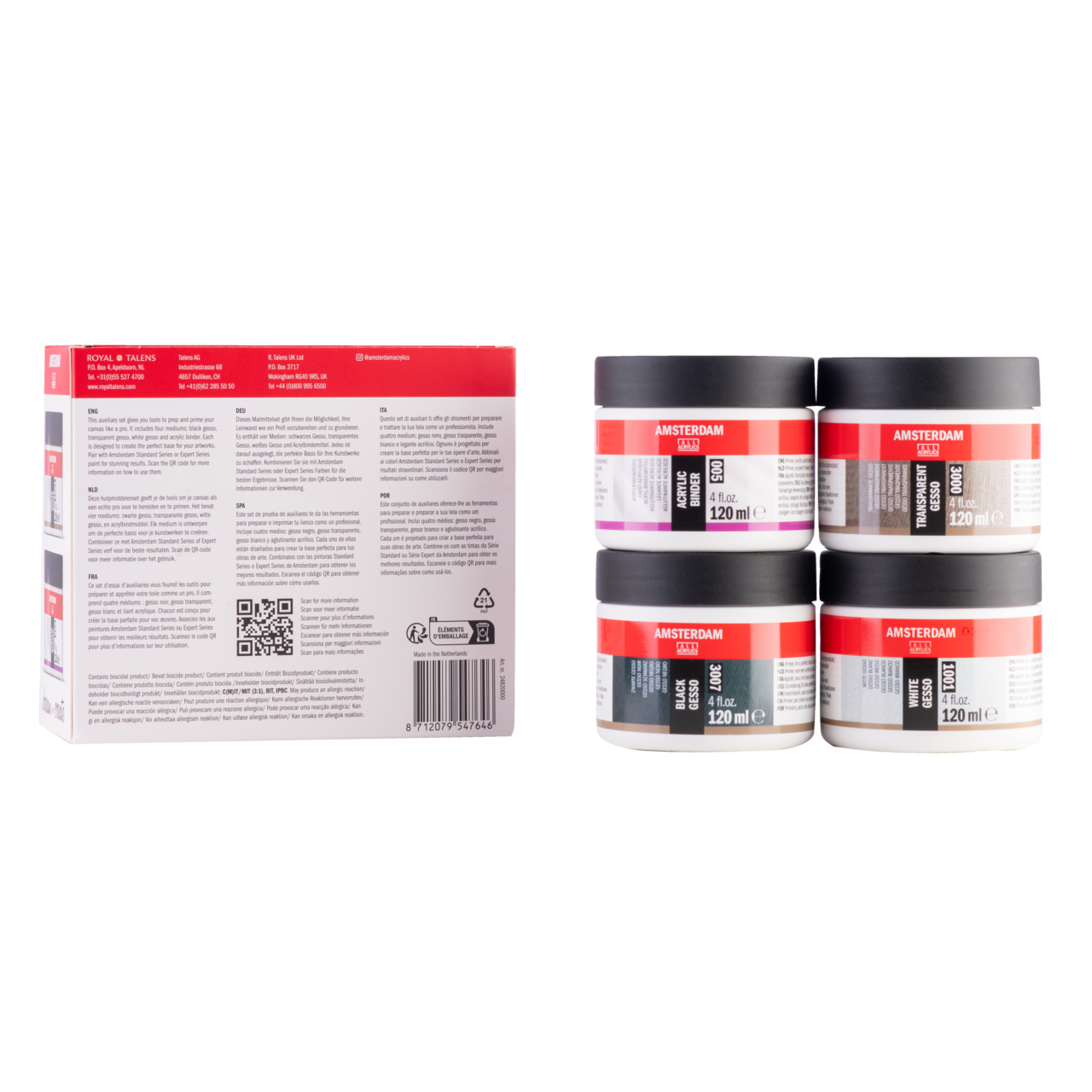 Das Amsterdam Prep & Prime Medium Set ist das ideale Probeset, um Ihre Leinwand wie ein Profi vorzubereiten. Es enthält vier Malmittel, die eine perfekte Grundlage schaffen: Schwarzes Gesso, Transparentes Gesso, Weißes Gesso und Acrylbindemittel.
