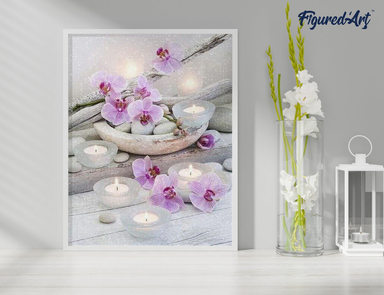 Bestellen Sie das Diamond Painting Set von Figured’Art und erleben Sie entspannte Kreativzeit mit einem fertigen, glitzernden Ergebnis — Blumen und Kerzen, die Ihrem Zuhause Flair verleihen.