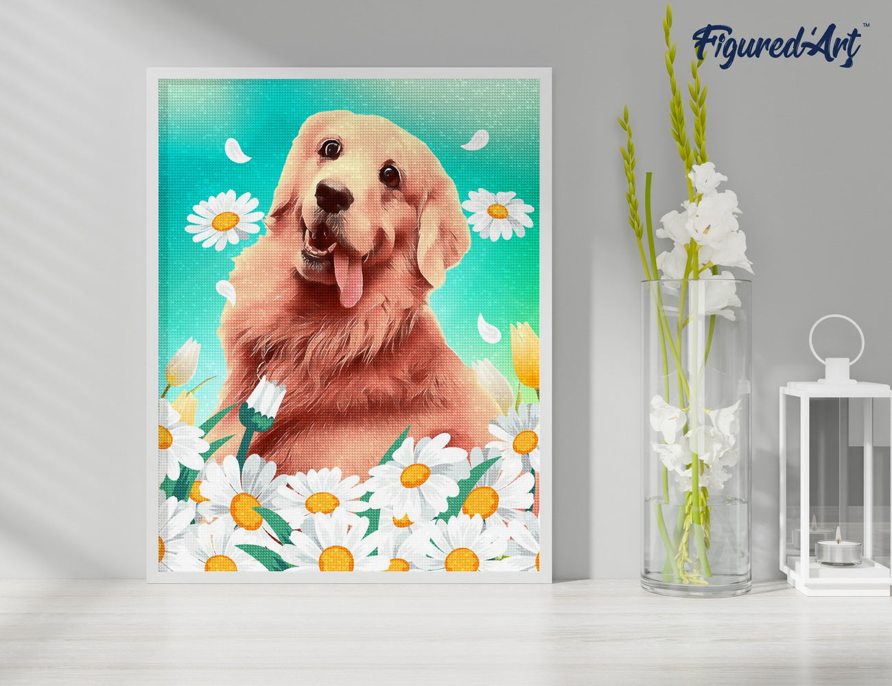 Entdecken Sie mit dem Diamond Painting Set von Figured’Art eine entspannende Kreativarbeit. Die gerollte Leinwand im Format 40x50 cm zeigt den charmanten Golden Retriever und liefert alles, was Sie für ein beeindruckendes Diamantbild benötigen.