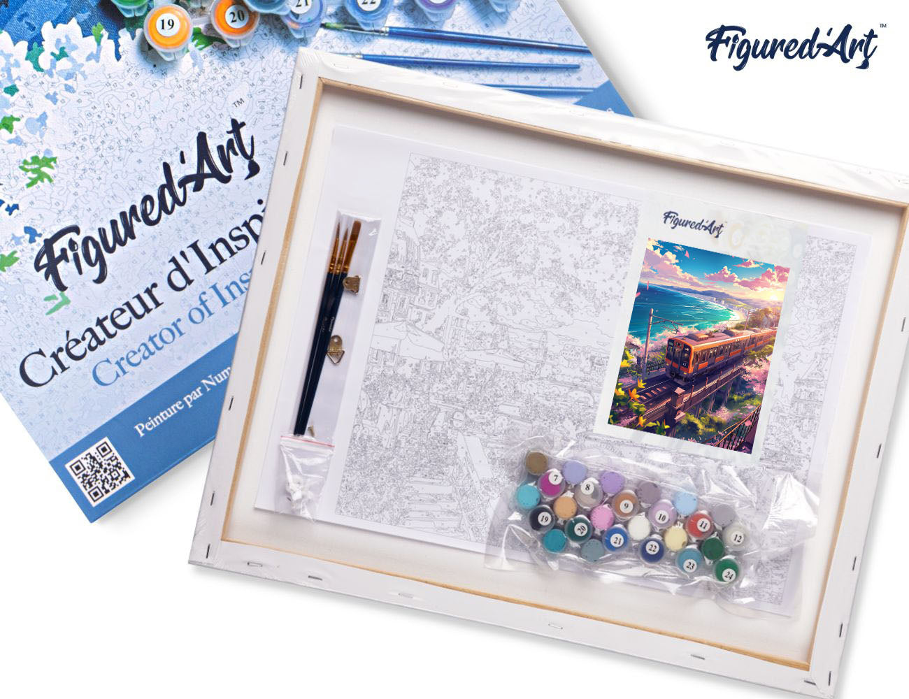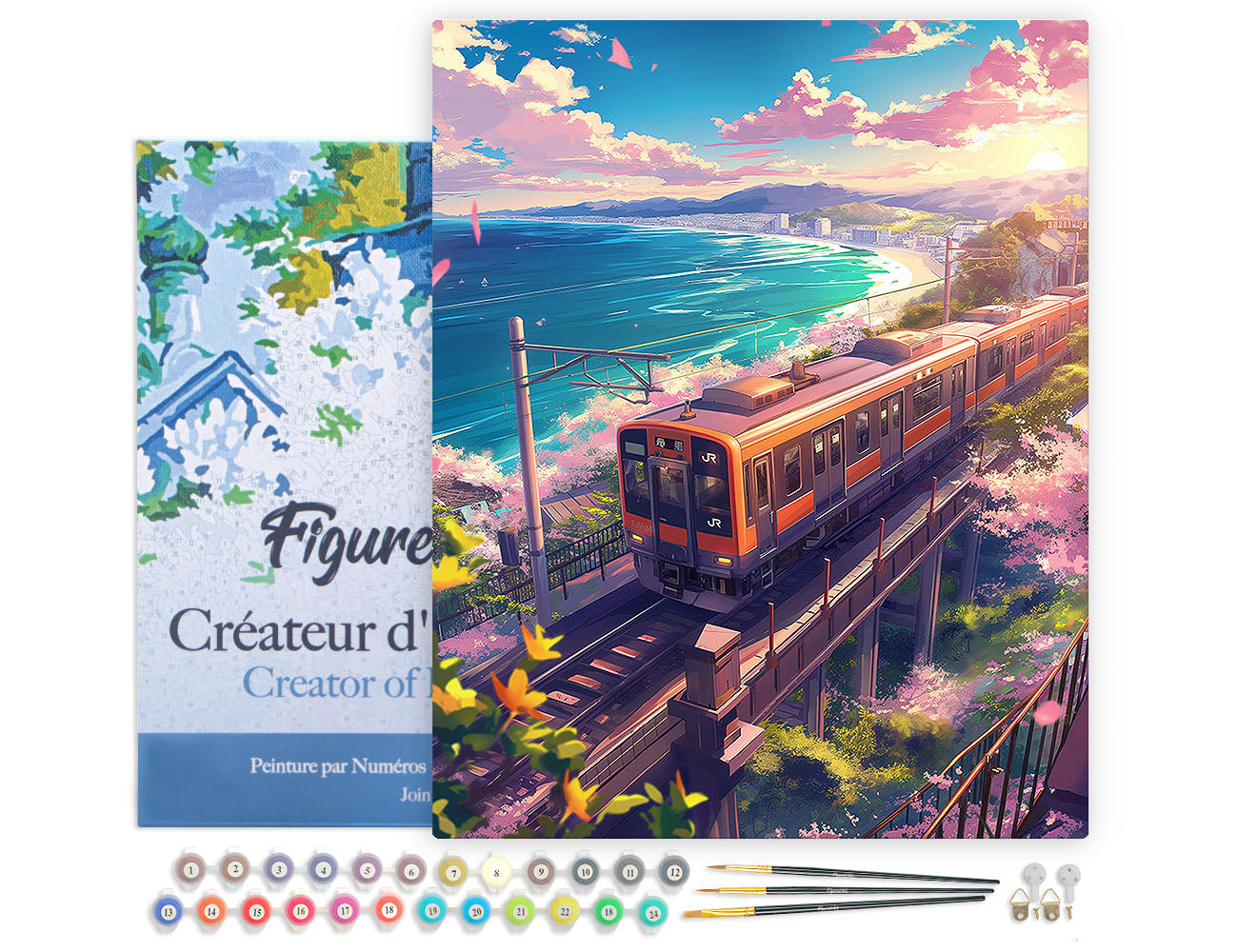 Malen nach Zahlen 40x50cm auf Keilrahmen gespannt Figured’Art Eisenbahnlinie mit Kirschblüten am Meer
