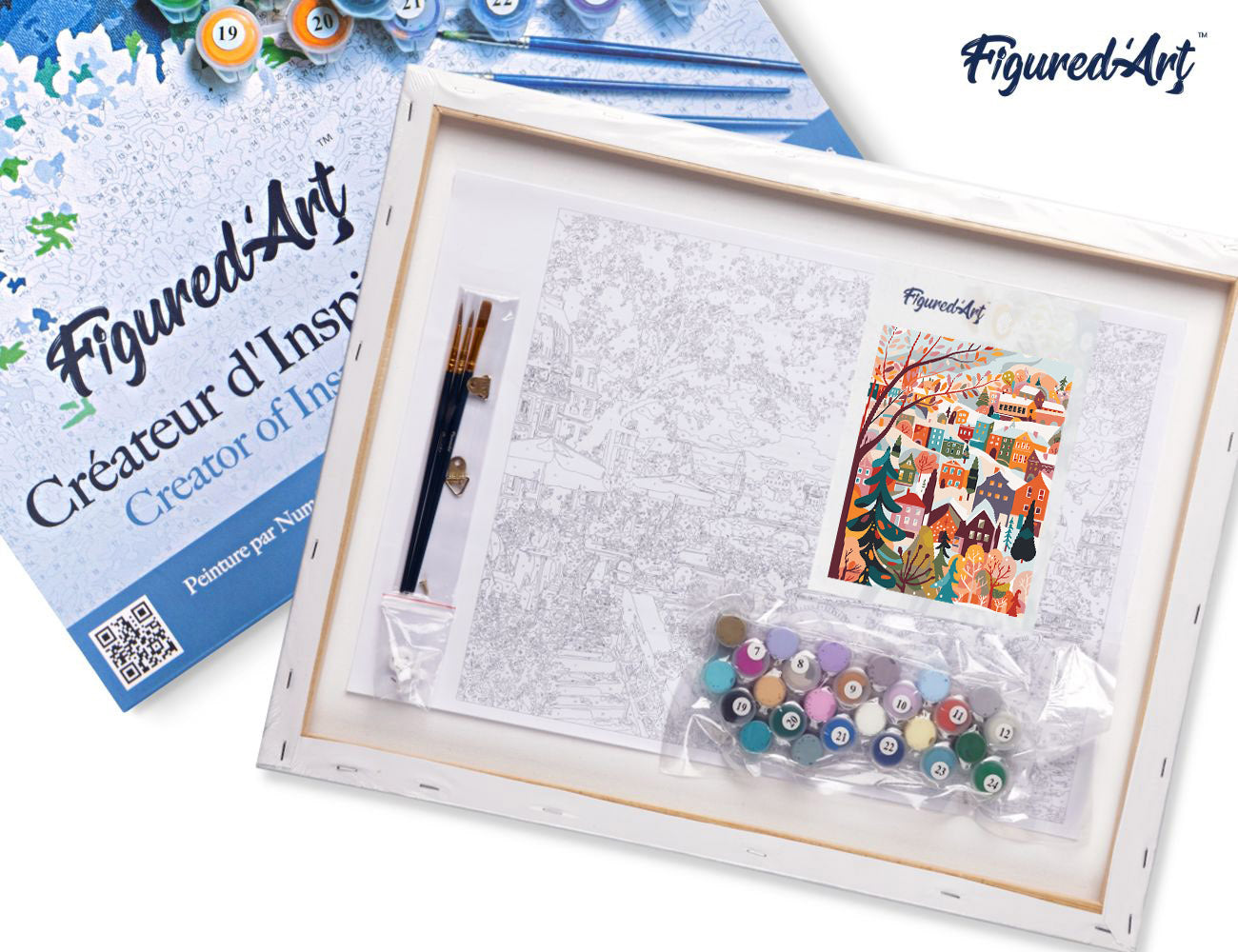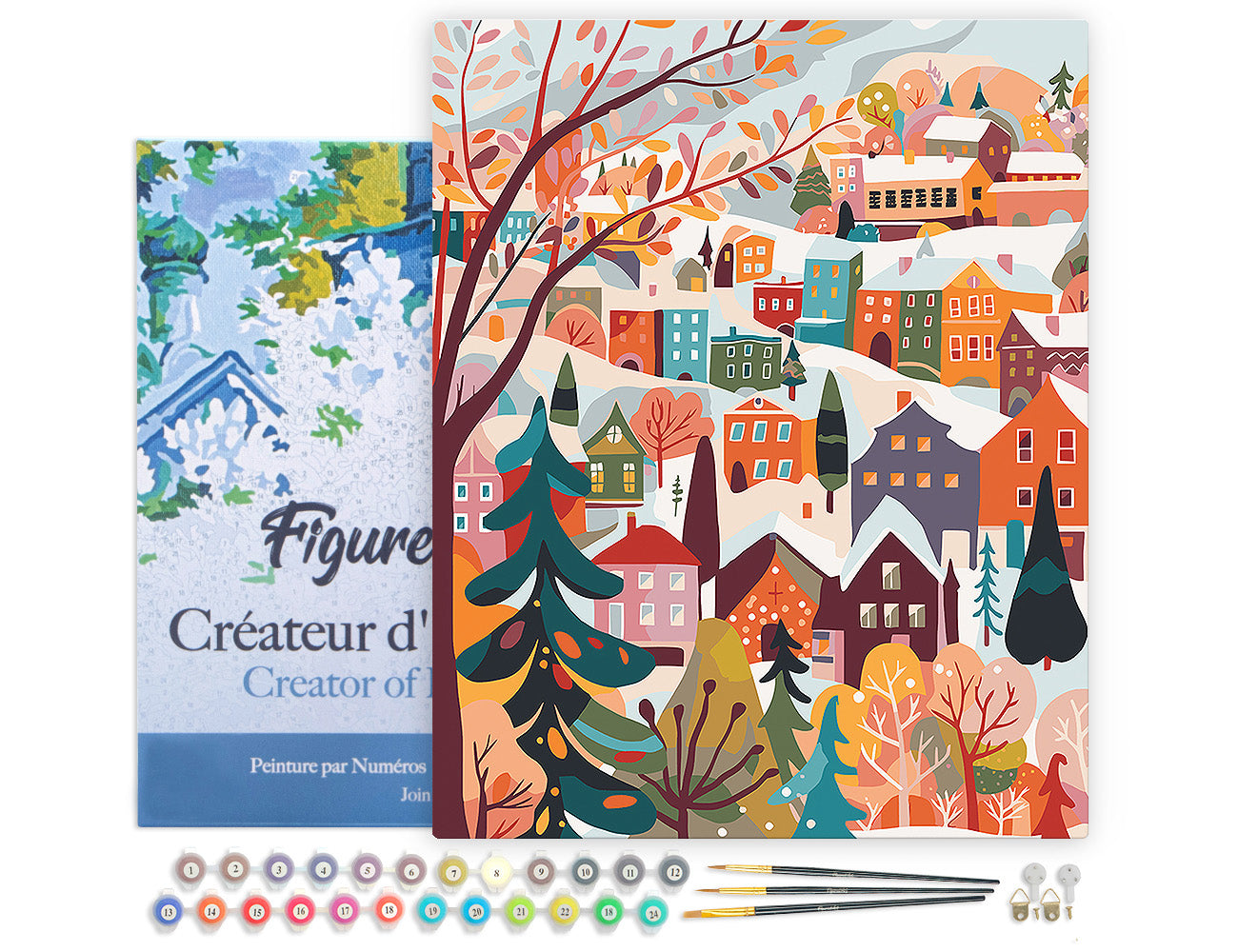 Malen nach Zahlen 40x50cm auf Keilrahmen gespannt Figured’Art Farbenfrohes Winterdorf