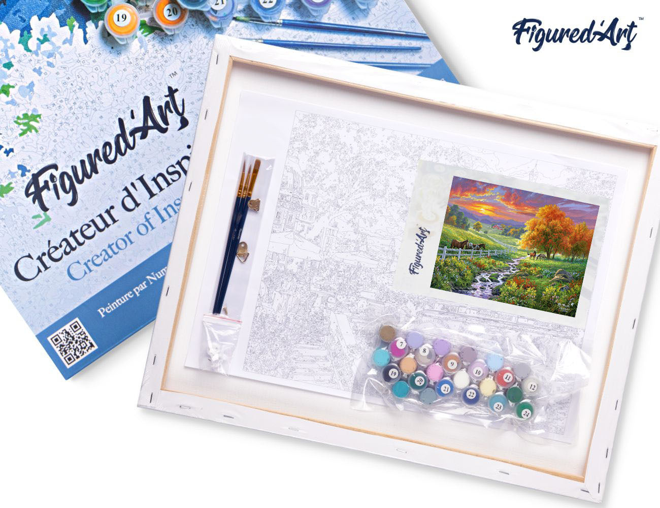 Malen nach Zahlen 40x50cm auf Keilrahmen gespannt Figured’Art Landschaftlicher Sonnenuntergang und Pferde