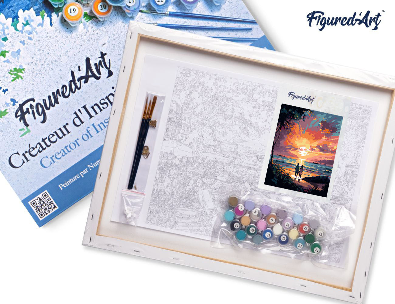 Malen nach Zahlen 40x50cm auf Keilrahmen gespannt Figured’Art Pärchen und bunter Sonnenuntergang