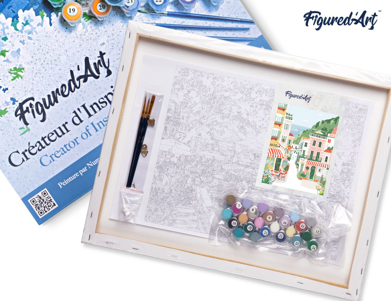 Malen nach Zahlen 40x50cm auf Keilrahmen gespannt Figured’Art Pastellfarbene Küstenstadt