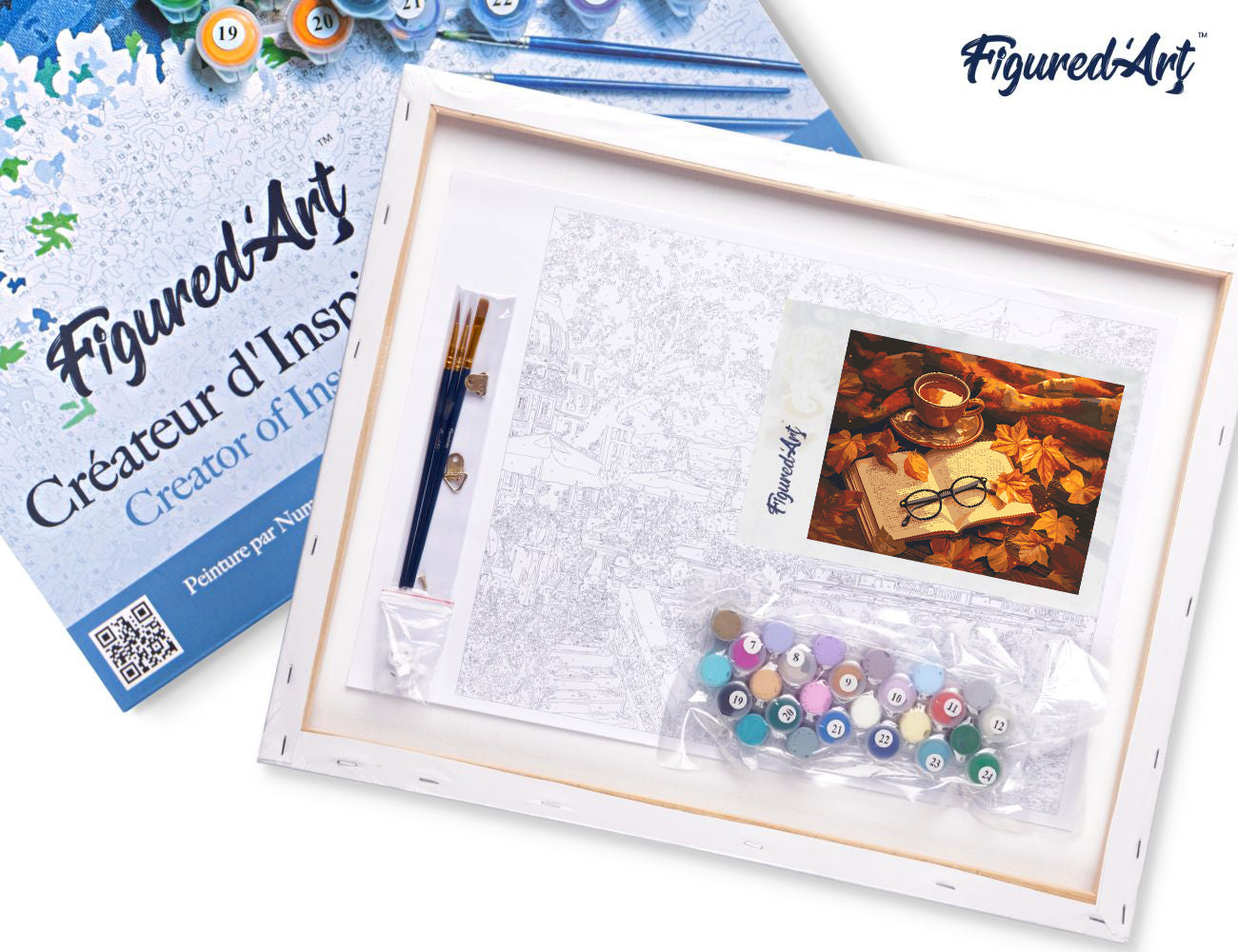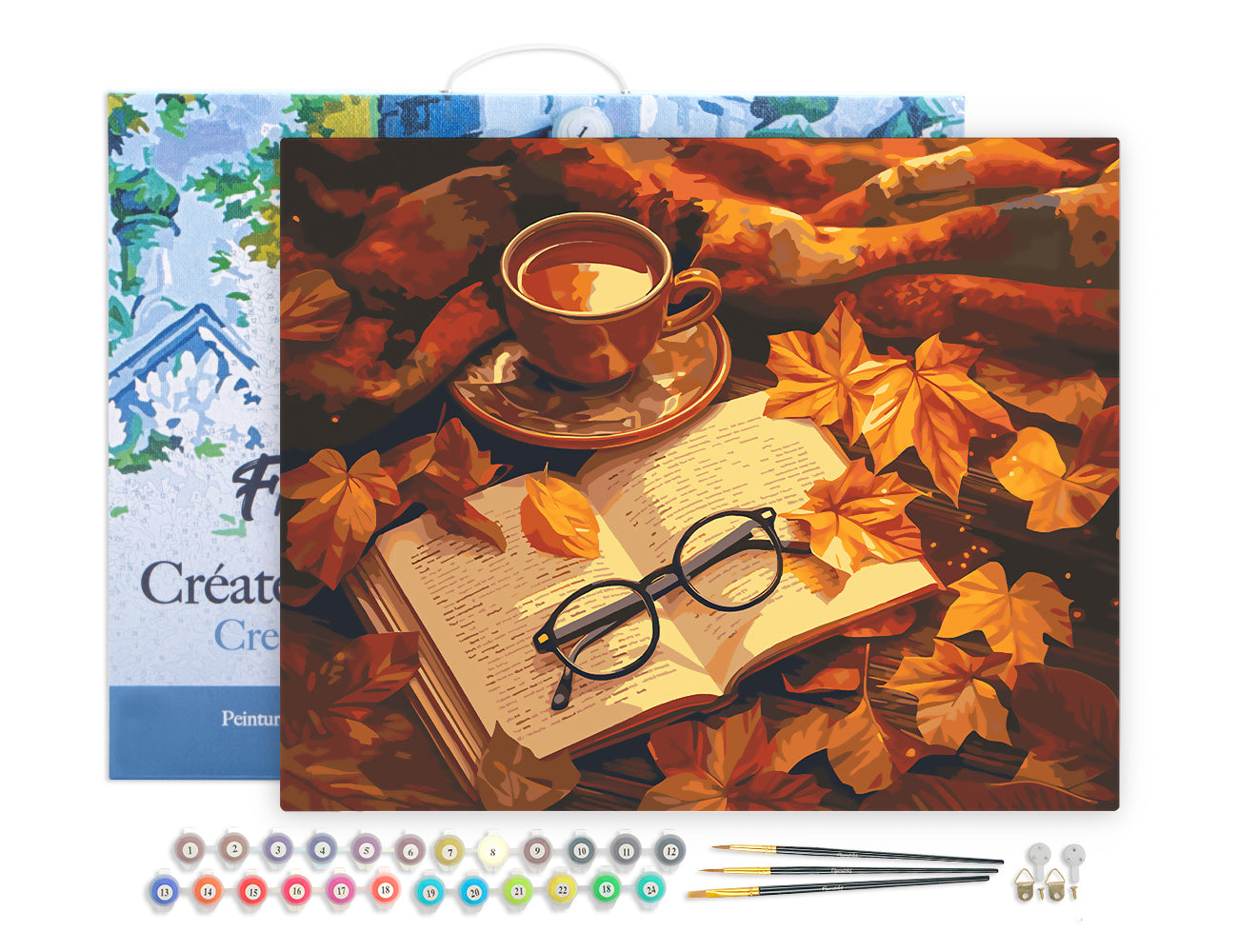 Malen nach Zahlen 40x50cm auf Keilrahmen gespannt Figured’Art Tee und Buch im Herbst