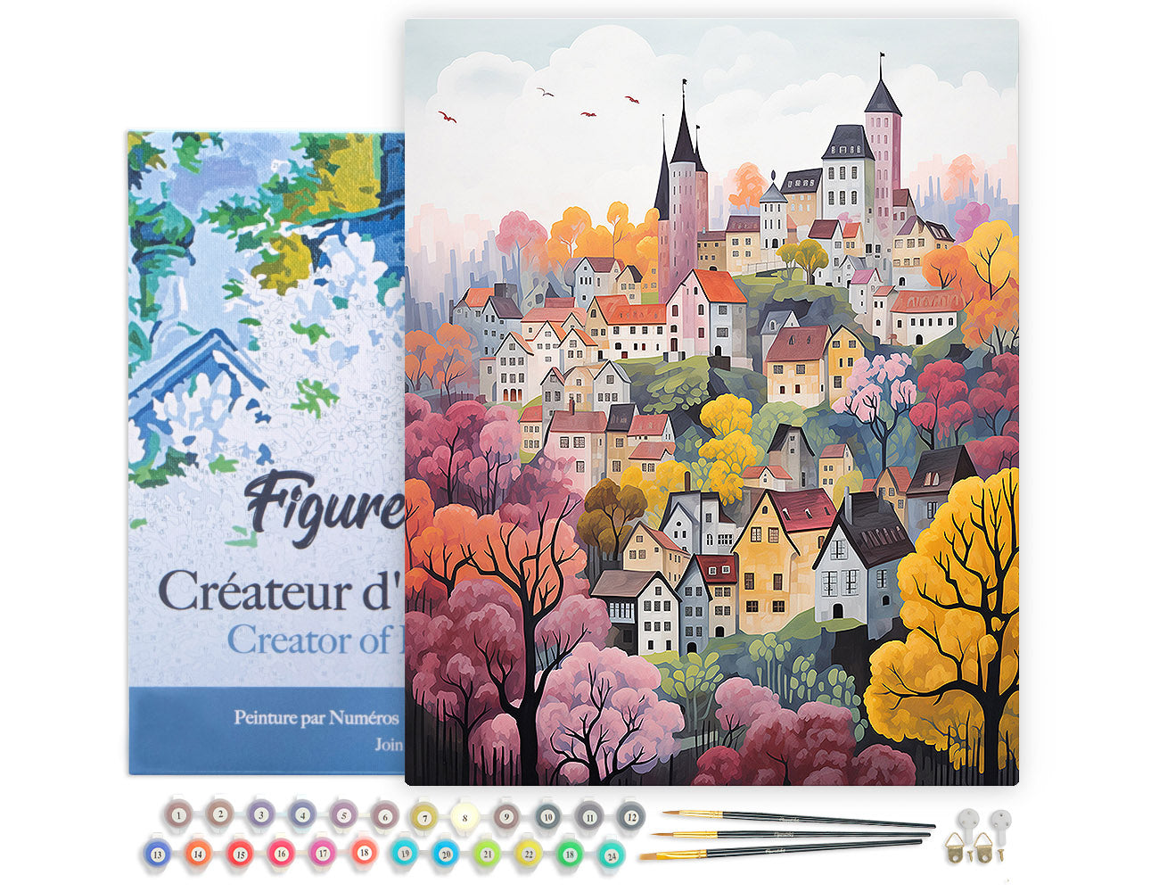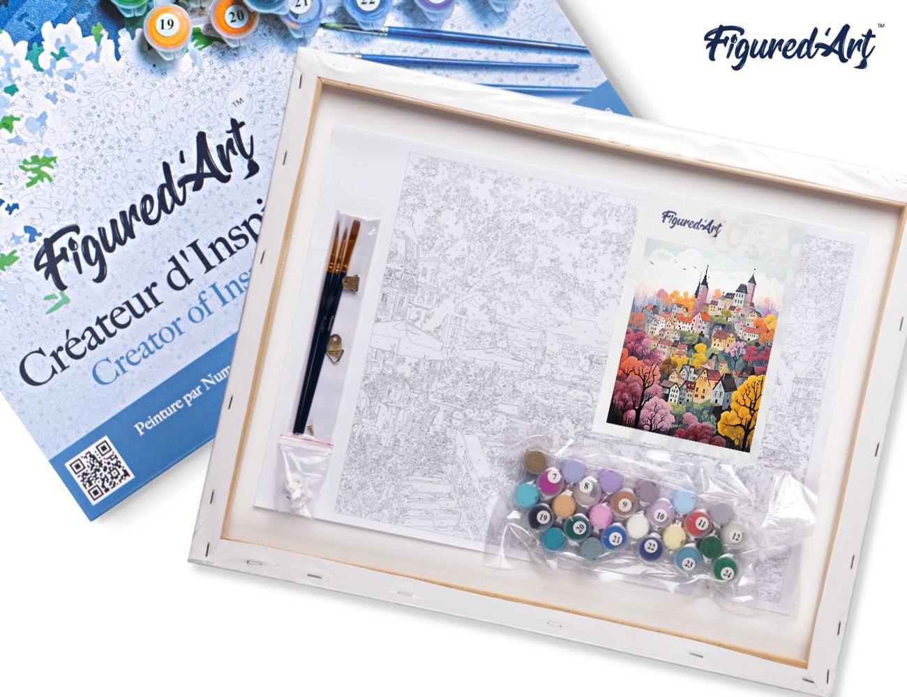 Malen nach Zahlen 40x50cm auf Keilrahmen gespannt Figured’Art Verzaubertes Dorf in Violett