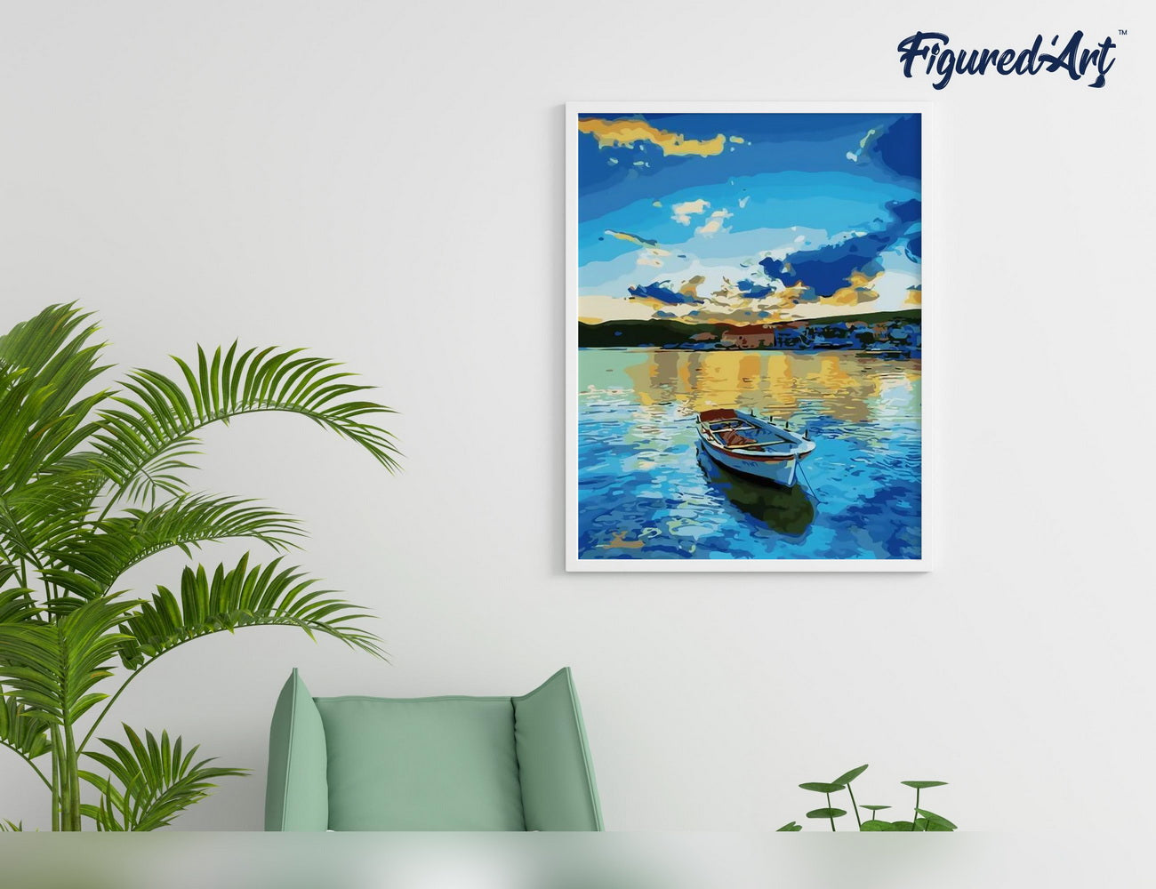 Fertiges Kunstwerk leicht gemacht – bestelle jetzt und starte dein eigenes Boot- und Sonnenaufgang-Meisterwerk mit Figured'Art.