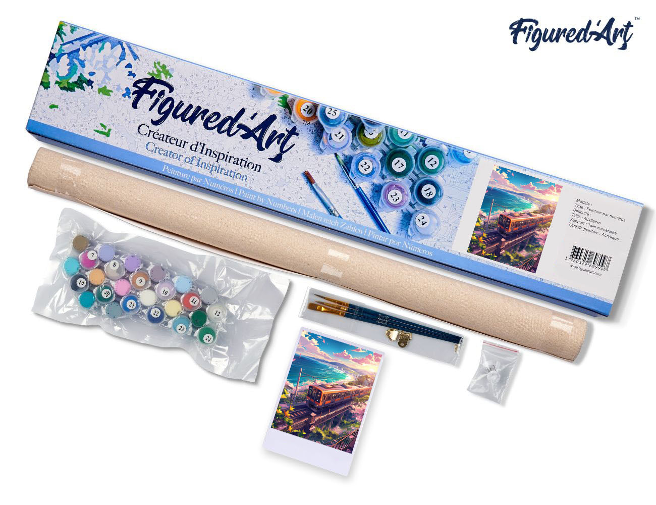Malen nach Zahlen 40x50cm ohne Keilrahmen Figured’Art Eisenbahn mit Kirschblüten am Meer