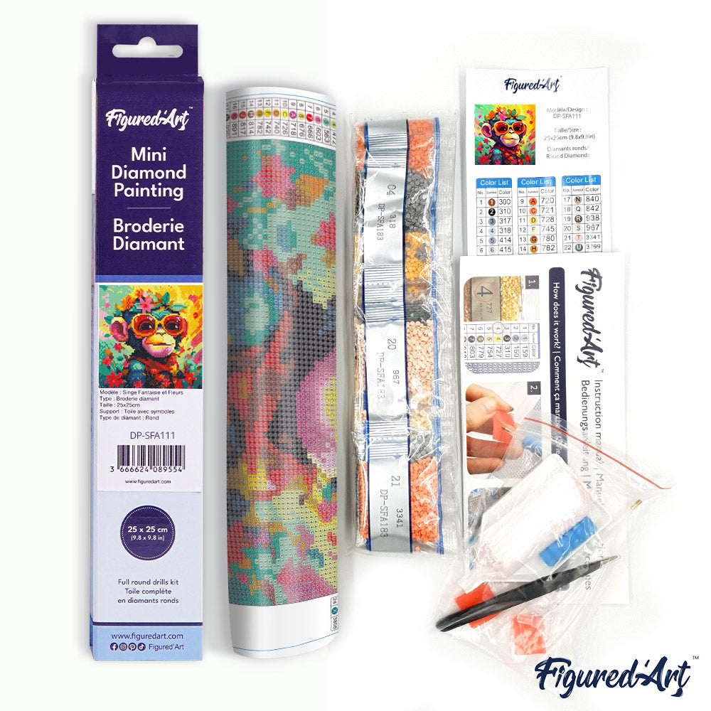 Erleben Sie kreativen Glanz mit dem Mini Diamond Painting Set von Figured'Art – kompakt, detailverliebt und sofort einsatzbereit. Das Motiv Fantasie Affe mit Blumen wird auf einer selbstklebenden Leinwand in 25x25 cm zum strahlenden Hingucker. Perfekt für Anfänger und Fortgeschrittene, die Freude am kunstvollen Stein-Glitzer haben.