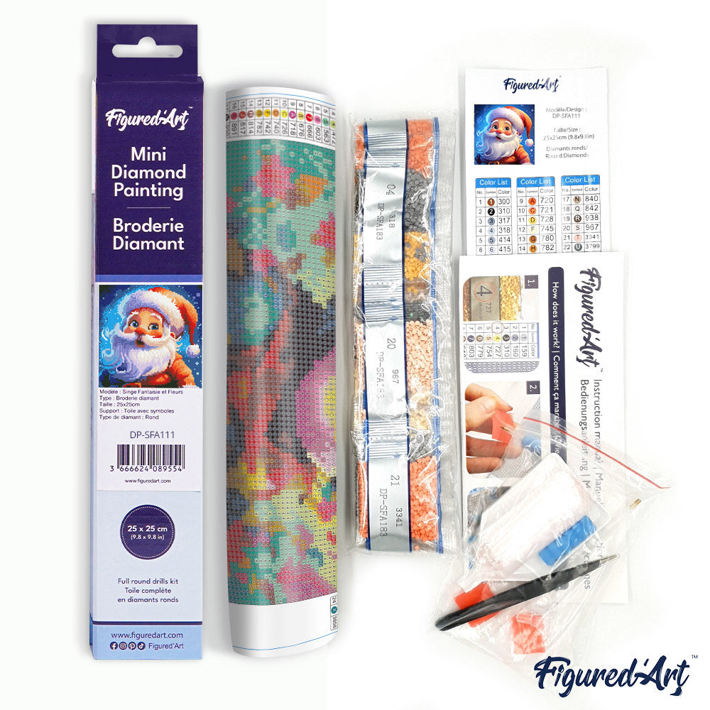 Erleben Sie die kreative Freude des Mini Diamond Painting in kompakter Größe: 25 x 25 cm ohne Keilrahmen, präsentiert von Figured'Art mit dem charmanten Motiv Lächelnder Weihnachtsmann. Dieses Set verwandelt Ihre Bastelzeit in ein funkelndes Kunstwerk für Ihr Zuhause oder als besonderes Geschenk.