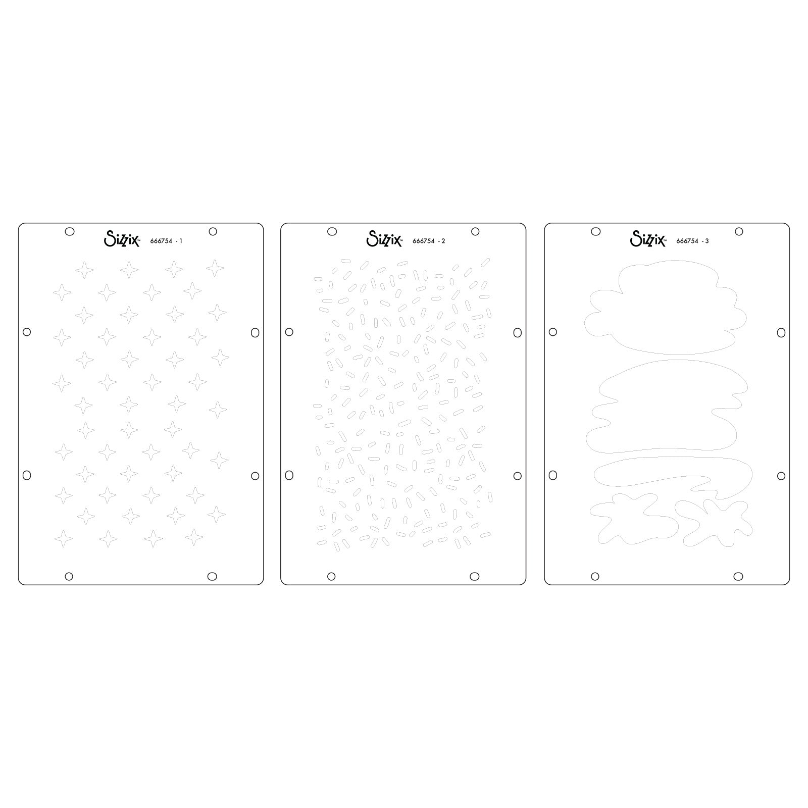 Studio Stempelset 7er-Pack / 3er-Pack Schablonen – "Create" von Cat Kerr bietet vielseitige Stempel- und Schablonen-Tools für Karten, Scrapbooking und Mixed-Media-Projekte. Das Set stammt von Sizzix und kombiniert sieben Stempelmotiva mit drei passenden Schablonen für klare Muster und wiederholbare Designs.
